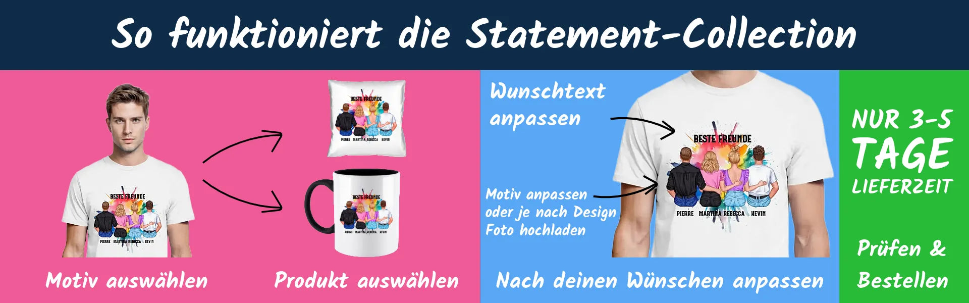 Gestalte ganz persönliche Geschenke mit deinen eigenen Fotos, Namen oder Wunschtexten – einfach zu gestalten, hochwertig gedruckt und schnell bei dir zu Hause.