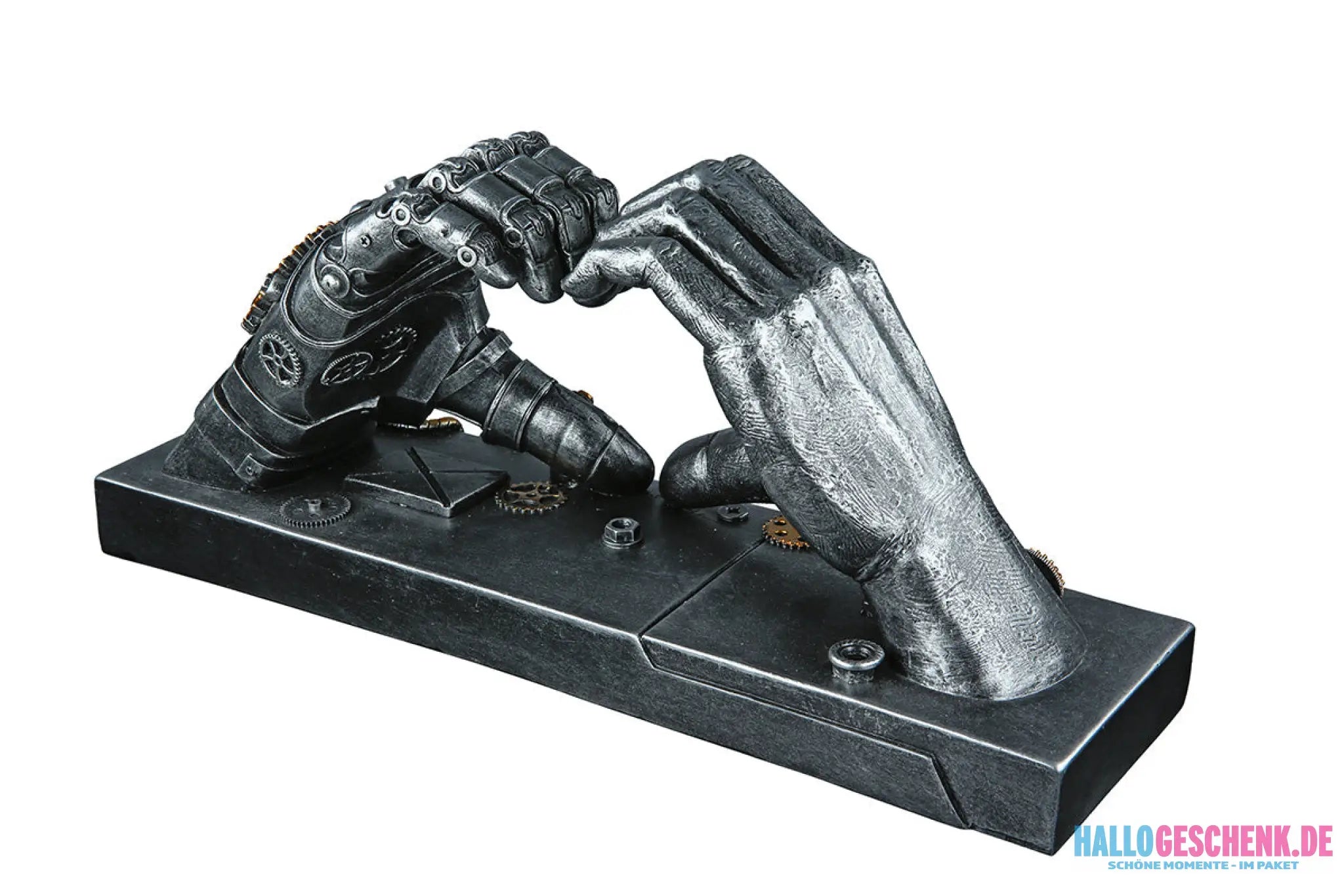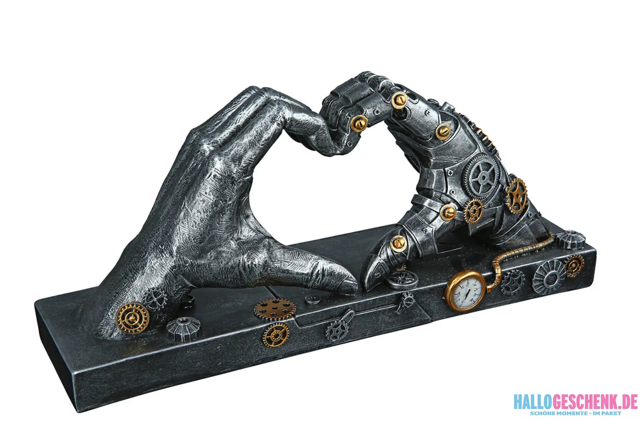 Zwei Hände formen ein Herz – ein Symbol für Liebe, Verbundenheit und Menschlichkeit, das unter die Haut geht. Die detailreiche Oberfläche mit metallischen Steampunk-Elementen verleiht dieser Skulptur eine kraftvolle Tiefe. Ein Geschenk, das sagt: „Ich halte dich fest – mit Herz und Stärke.“ ⚙️❤️