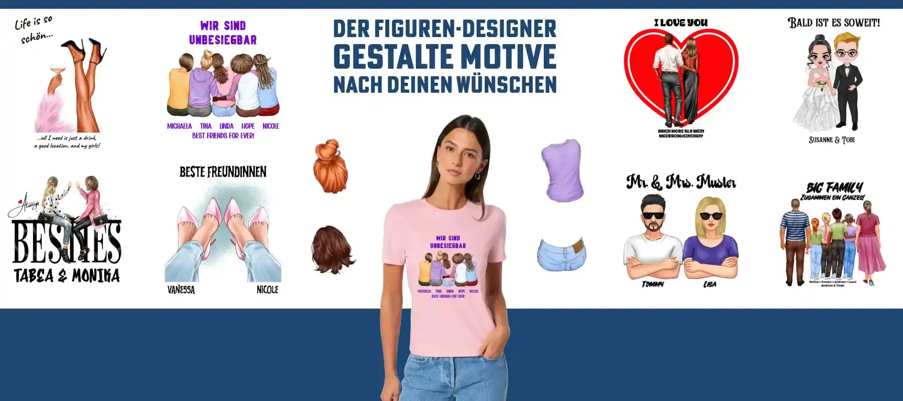 Zeichentrickfiguren mit wählbaren Hauttönen, Frisuren, Haar- & Kleidungsfarben, teilweise sogar mit der Option das Geschlecht und die Personenanzahl zu verändern – so wird aus jedem Motiv ein echter Hingucker!