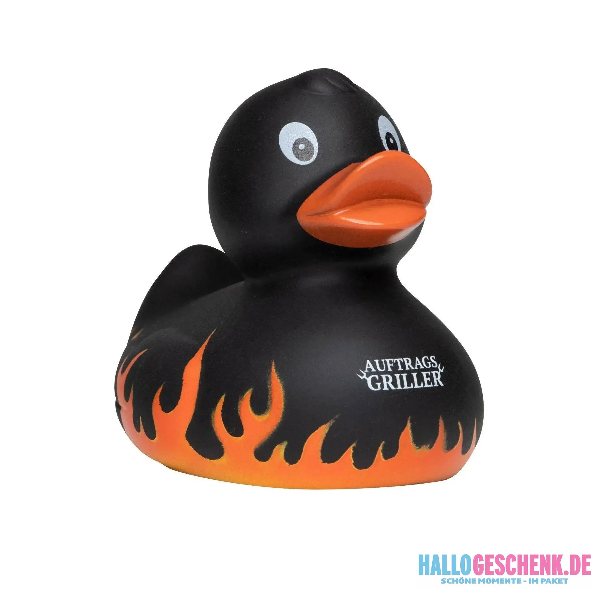 Quietsche-Ente Flammen mit Slogan Auftragsgriller