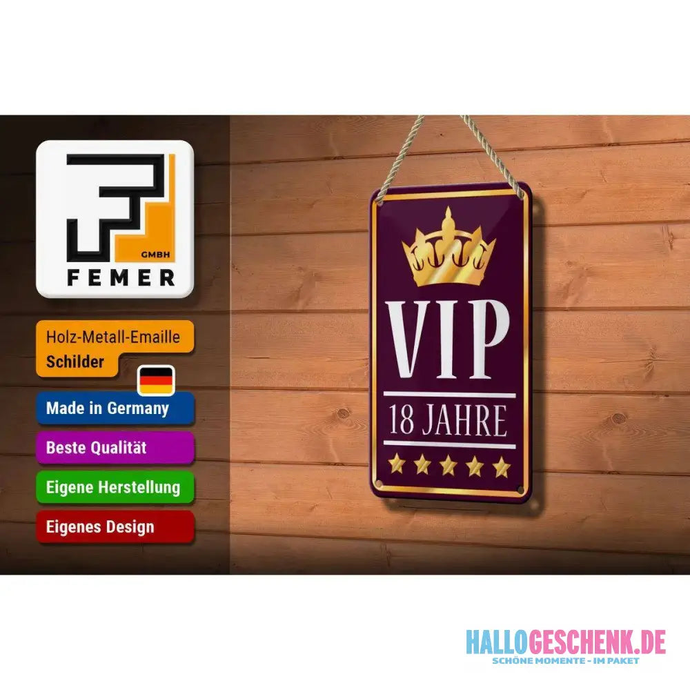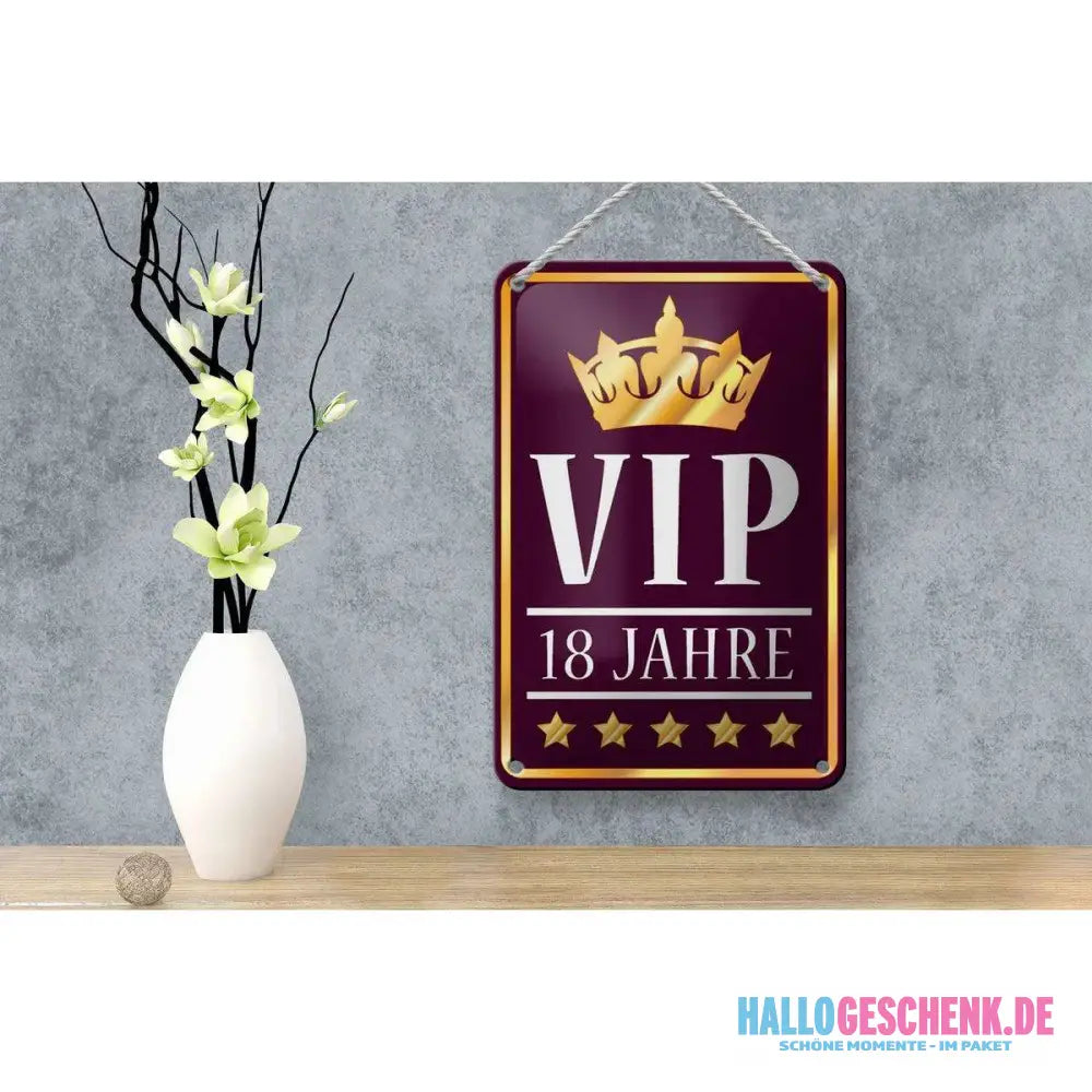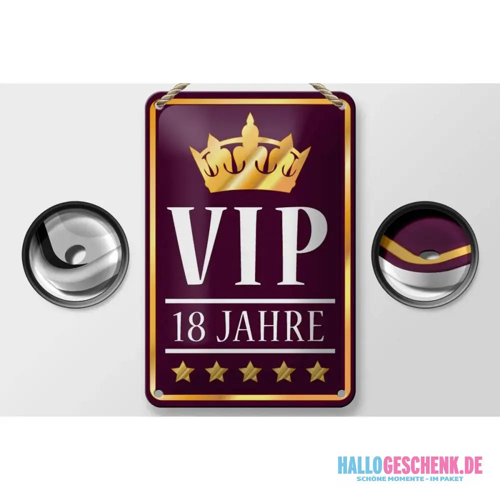 Blechschild Hinweis 12x18cm VIP 18 Jahre (lila/weiß) Dekoration