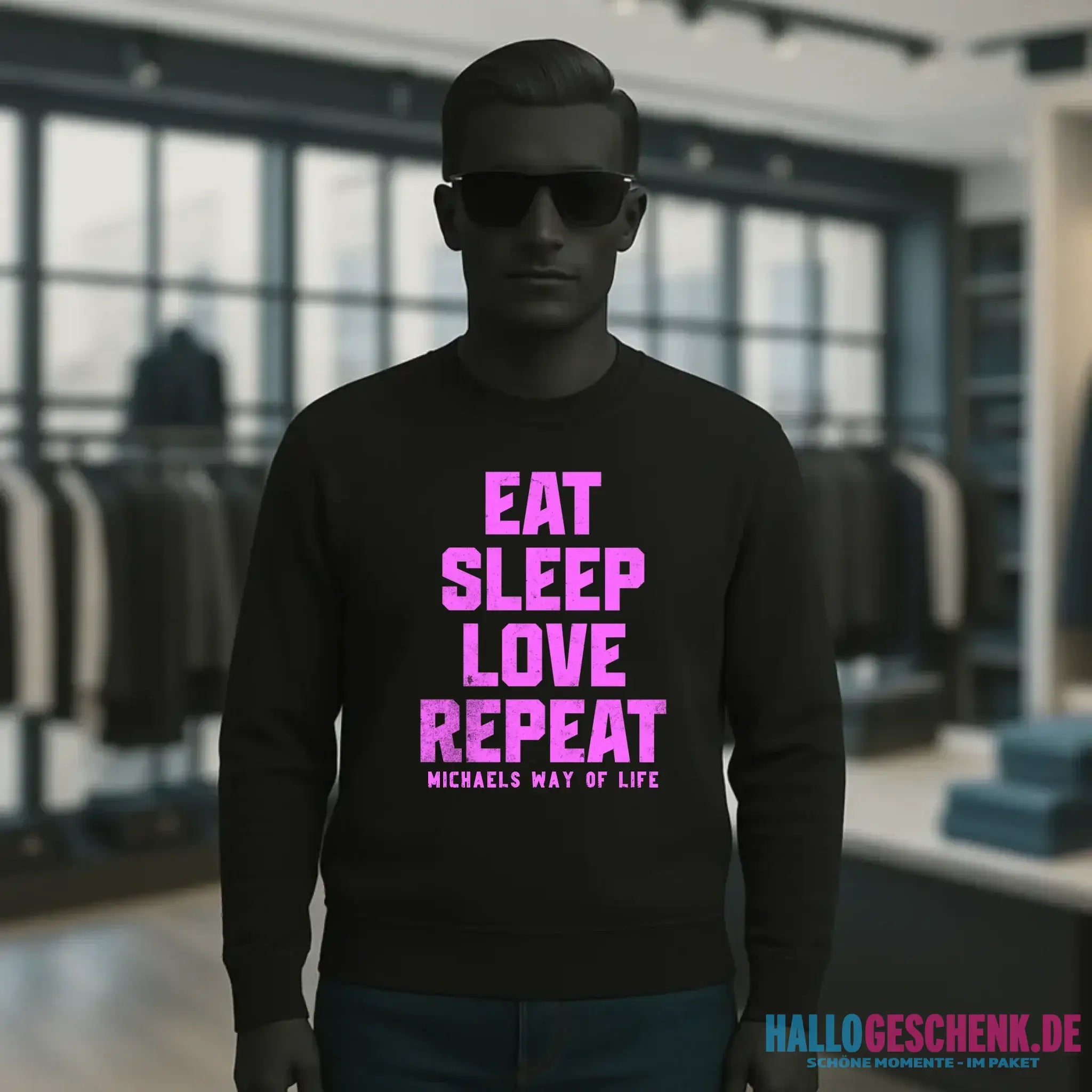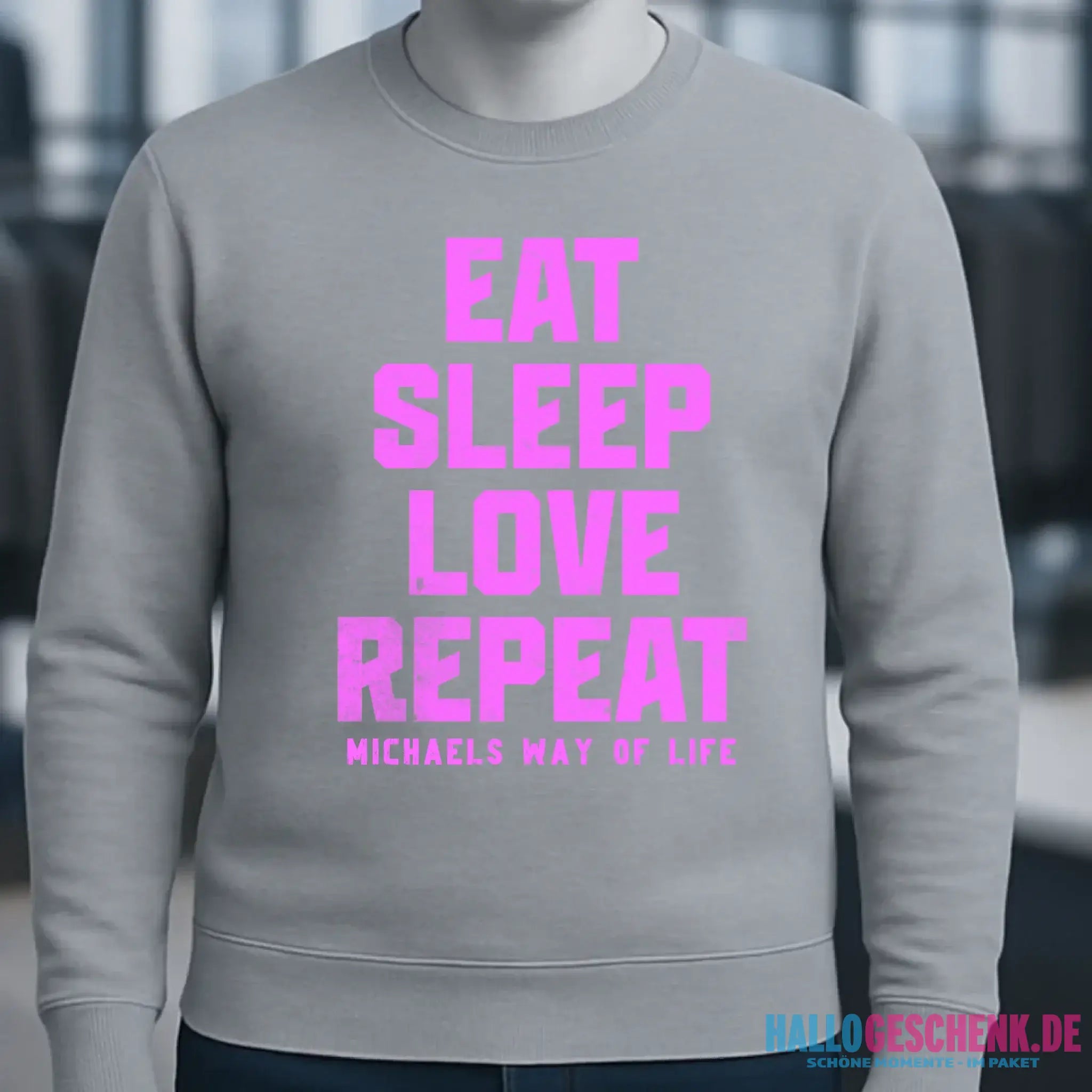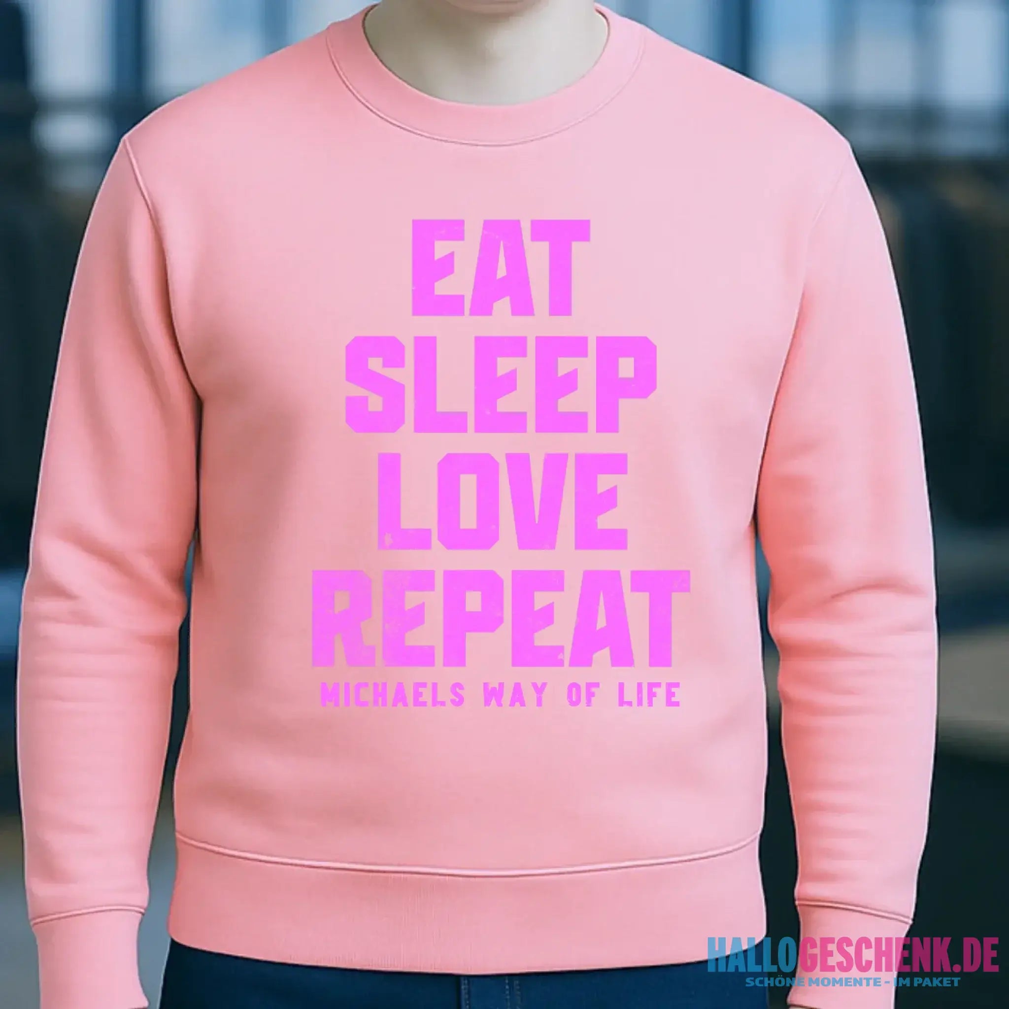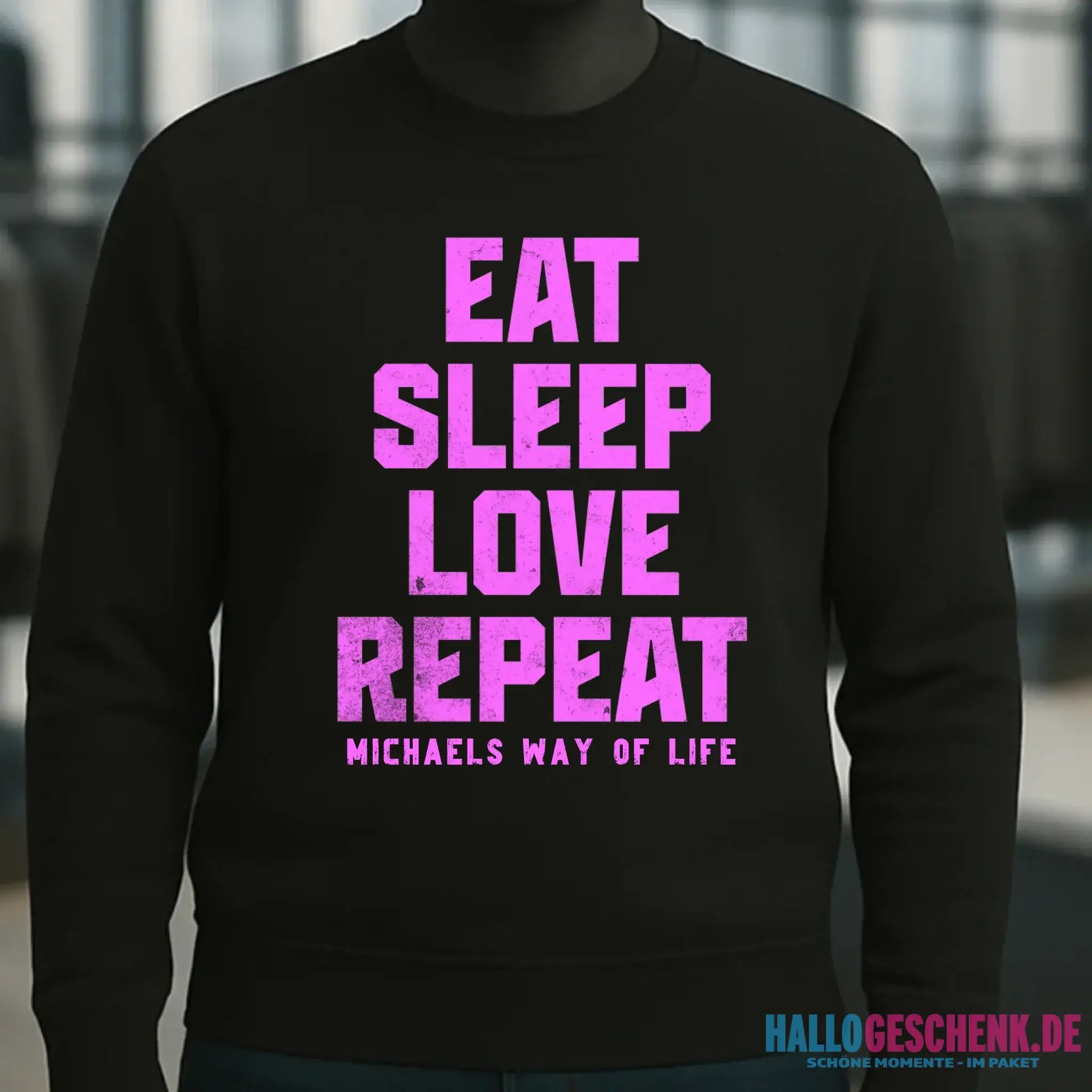 EAT SLEEP LOVE REPEAT + WUNSCHTEXT • Unisex Sweatshirt Bio-Baumwolle in 4 Farben XS-3XL • personalisiert