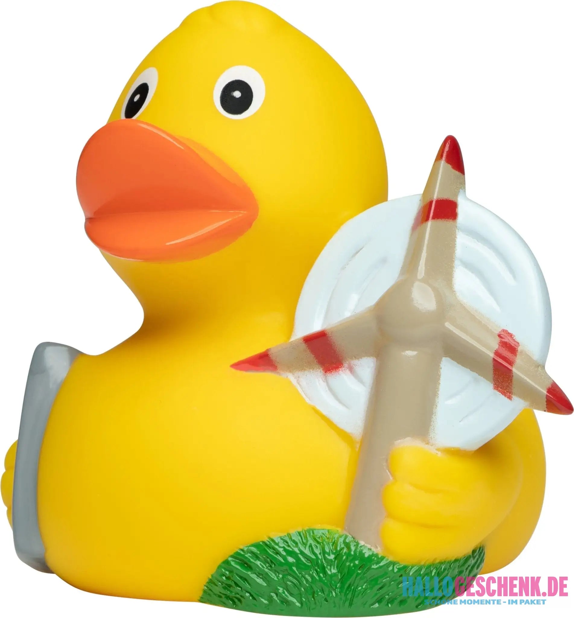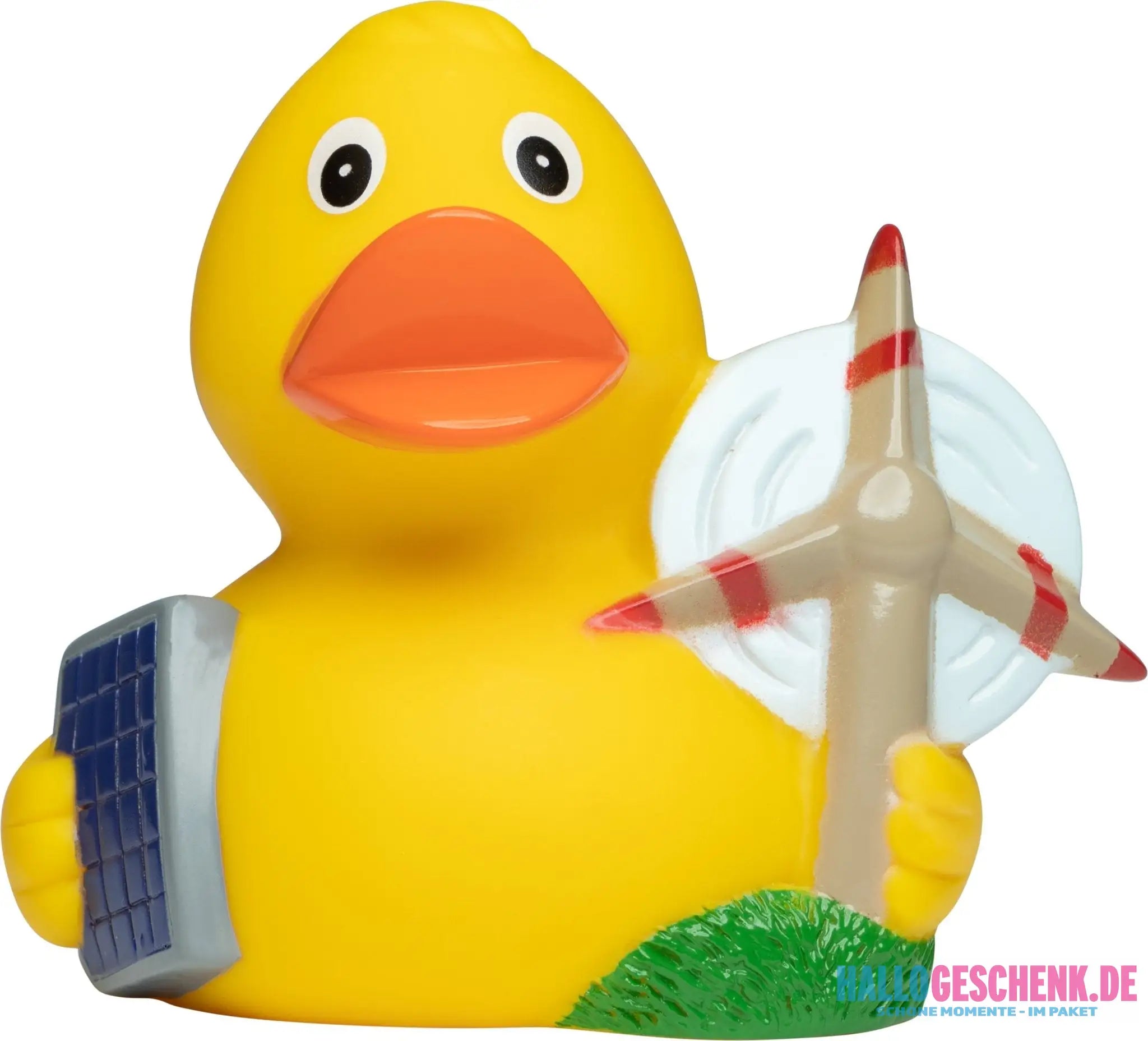 Die trendigen Badeenten gehen immer mit der Zeit. So engagieren sie sich auch für alternative Energiequellen. Die Quietsche-Ente Energie hat Solarpanel und Windrad fest im Flügel und verbreitet gerne Ihre Botschaft.