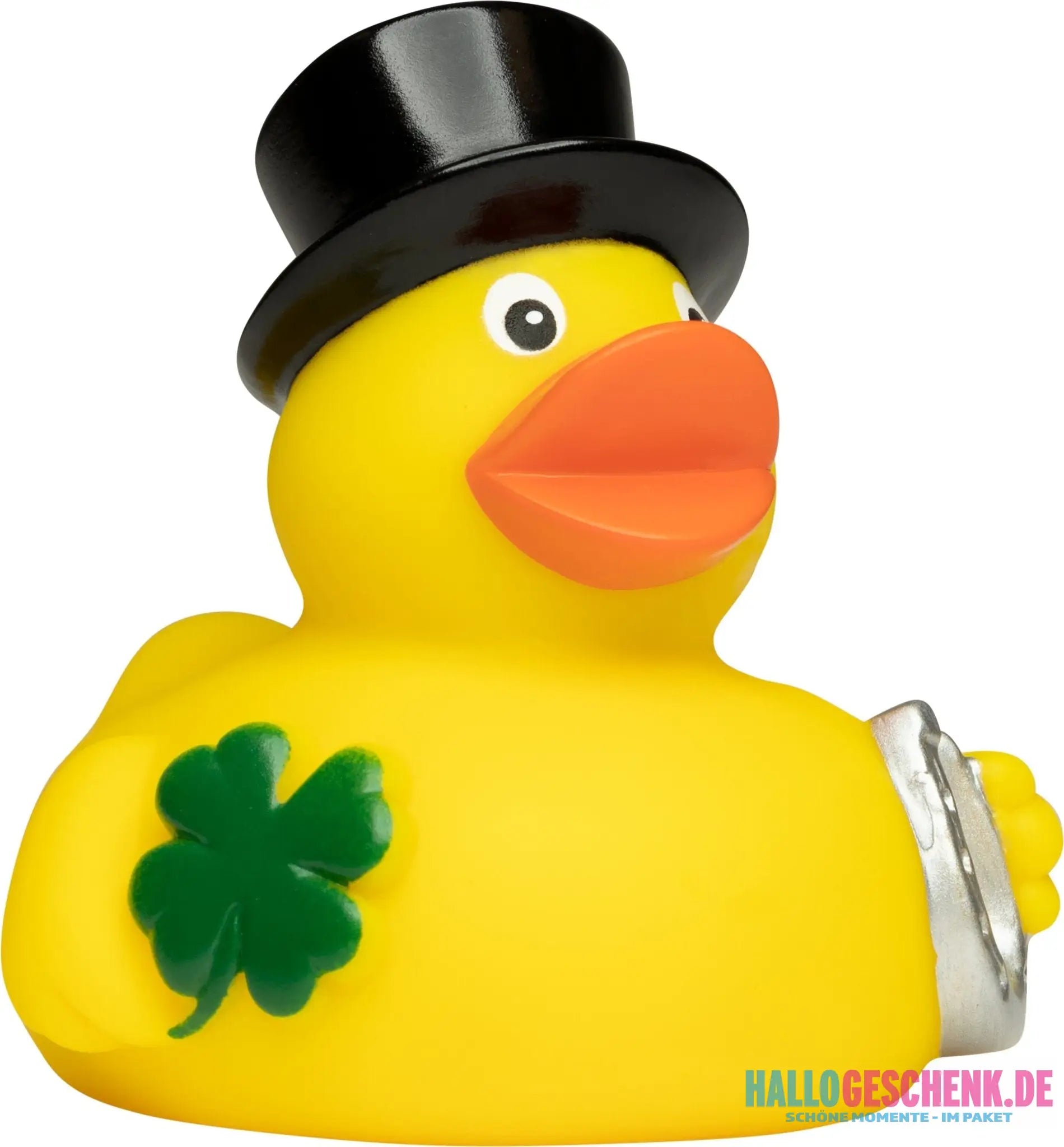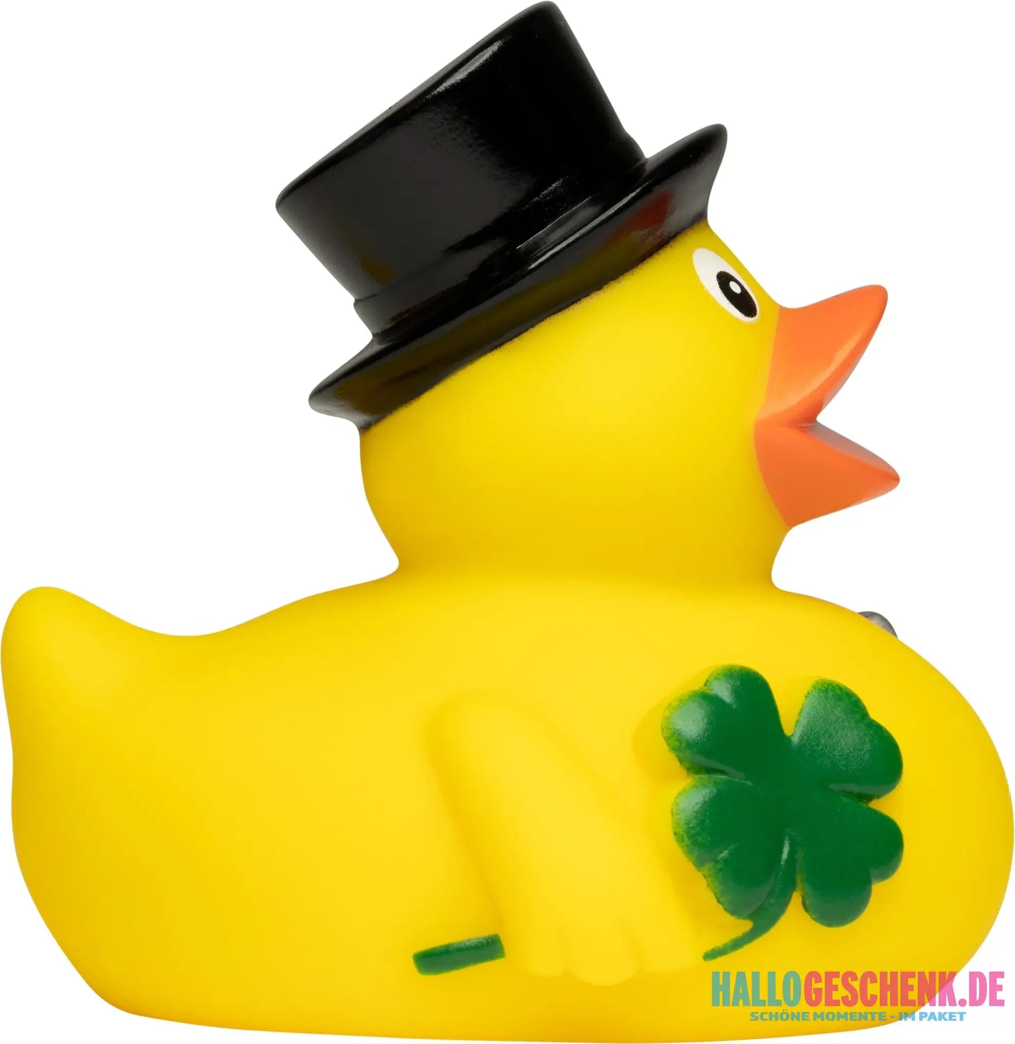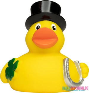 Hier kommt ein wahrer Glücksvogel. Er bringt nicht nur jedem ein strahlendes Lächeln sondern hat für die Extraportion Glück gleich ein Hufeisen und ein vierblättriges Kleeblatt dabei. Der schicke schwarze Zylinder erinnert an einen Schornsteinfeger, die Personifizierung des Glücks.