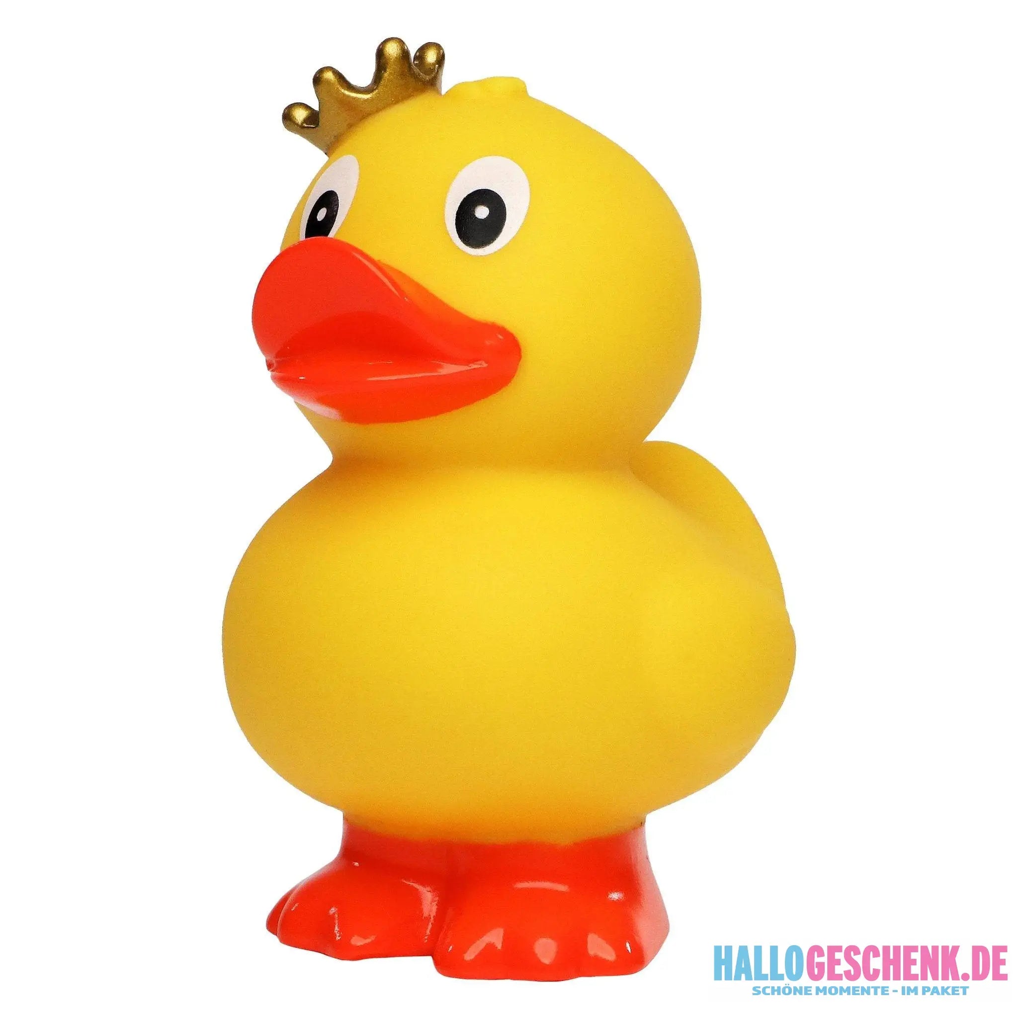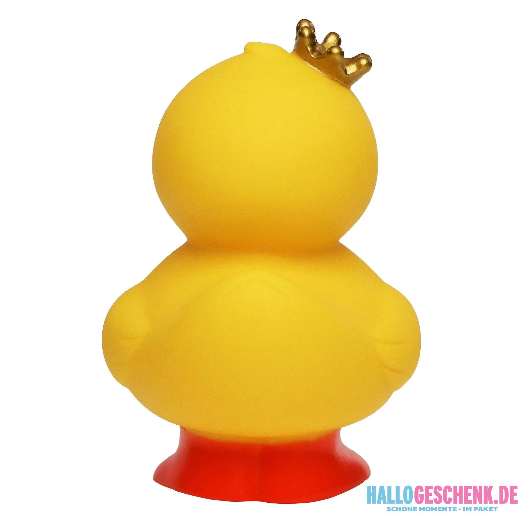Das stehende Entlein mit dezentem goldenen Krönlein ist ein besonders niedliches Exemplar der Gattung der Badeenten. Im klassischen gelben Gefieder und mit großen Kulleraugen gewinnt es jeden für sich. Auf den orangen Füßchen geht es im Watschelgang in Ihr Herz und Badezimmer. Mit dem separat erhältlichen Schwimmring ist die Quietsche-Ente "König, stehend" bereit für eine Schwimmrunde.