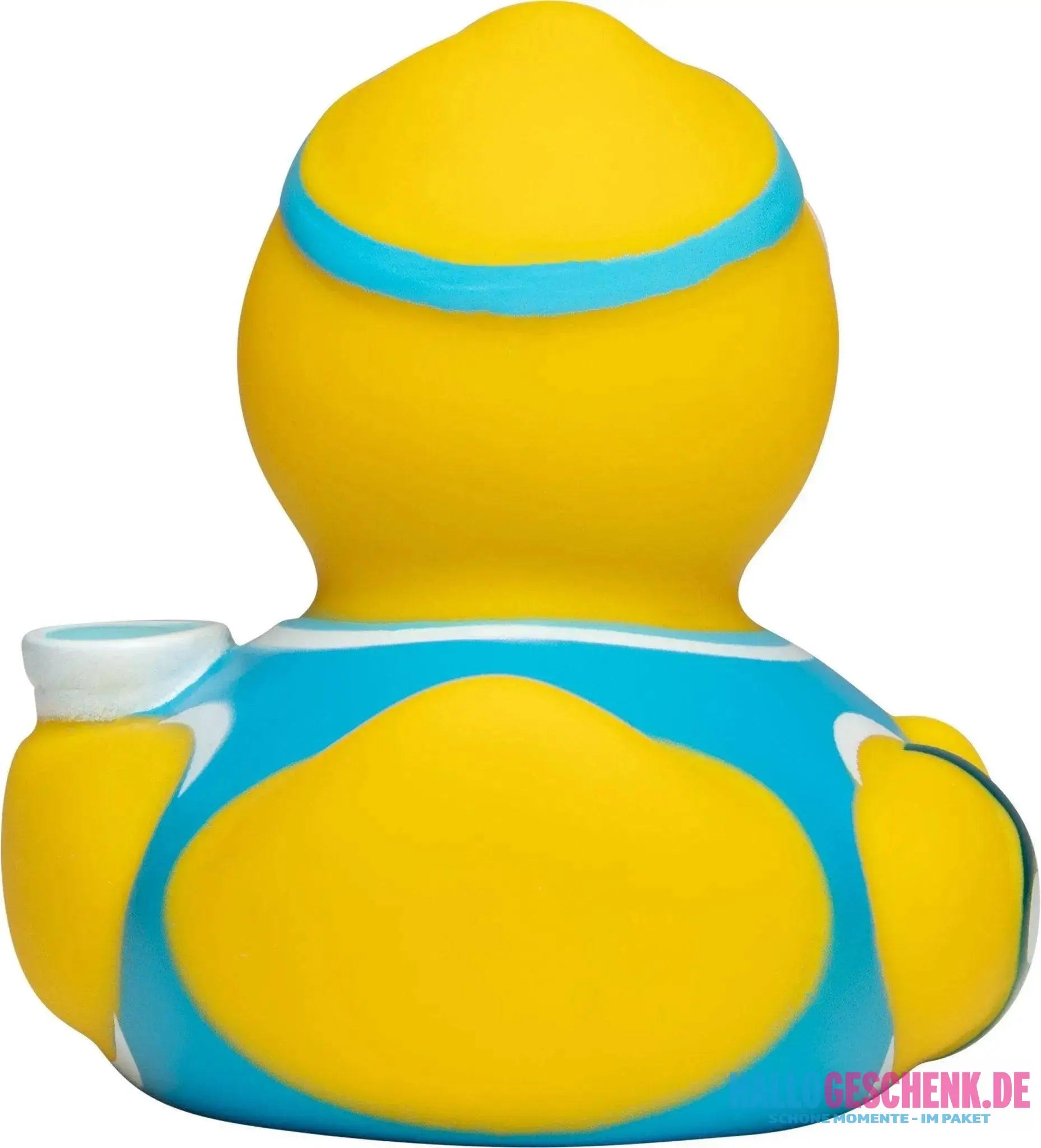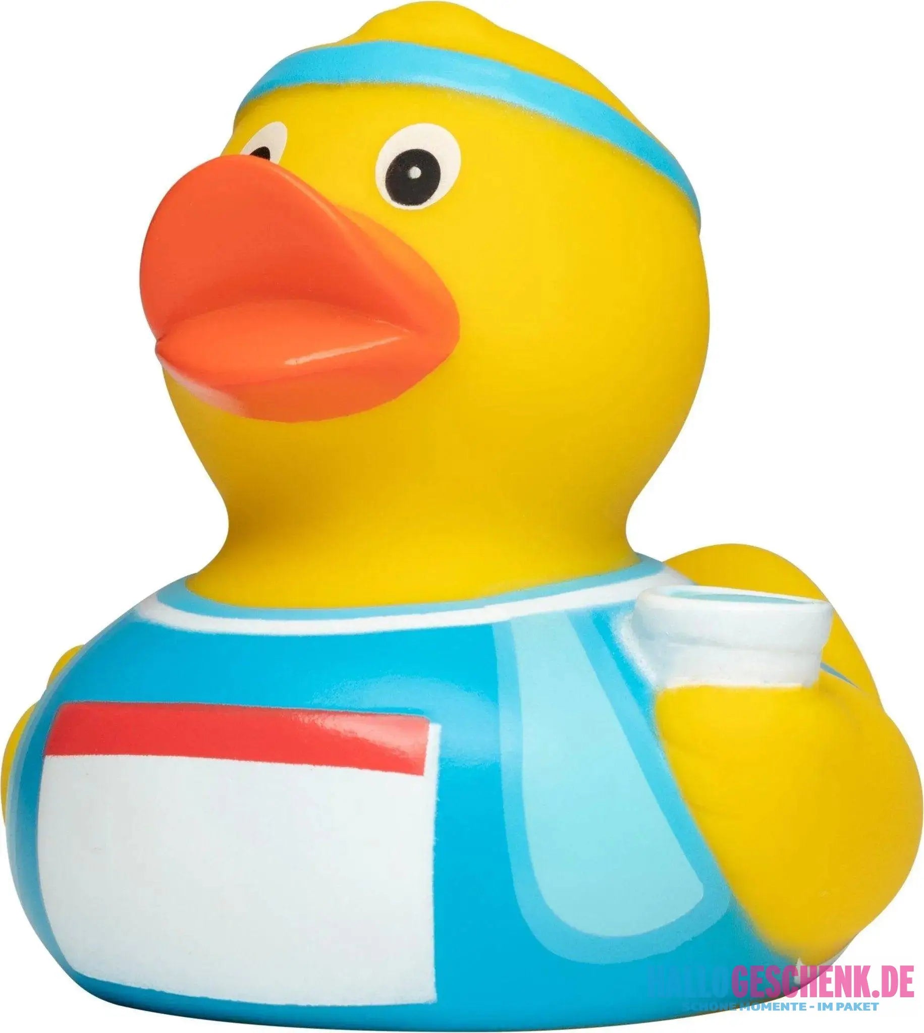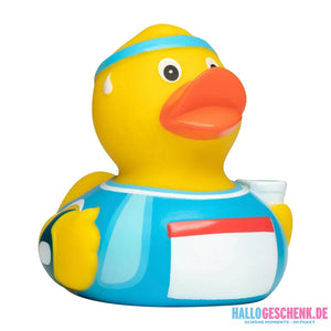 Die Sportskanone im hellblauen Trikot mit farblich passendem Stirnband gibt alles, um ganz vorne dabei zu sein. Den Puls im Blick und ein Becher Wasser zur Erfrischung, kann auch der Schweißtropfen an der Stirn die Quietsche-Ente Marathon nicht bremsen. Zur Belohnung ihrer Ausdauer freut sie sich auf ein entspannendes Bad.
