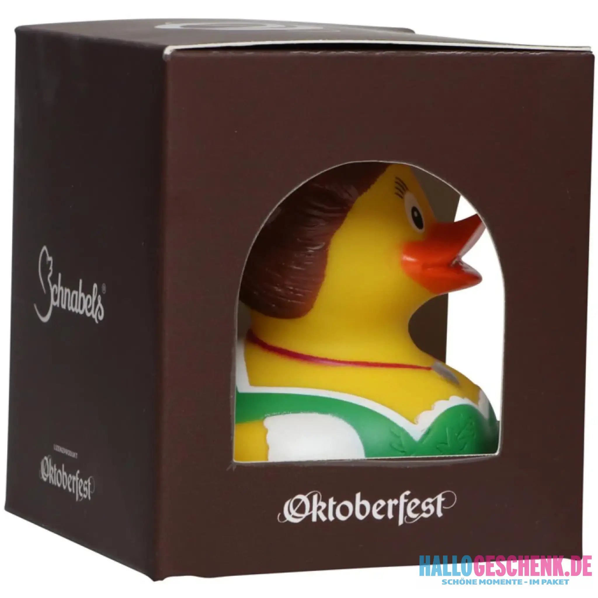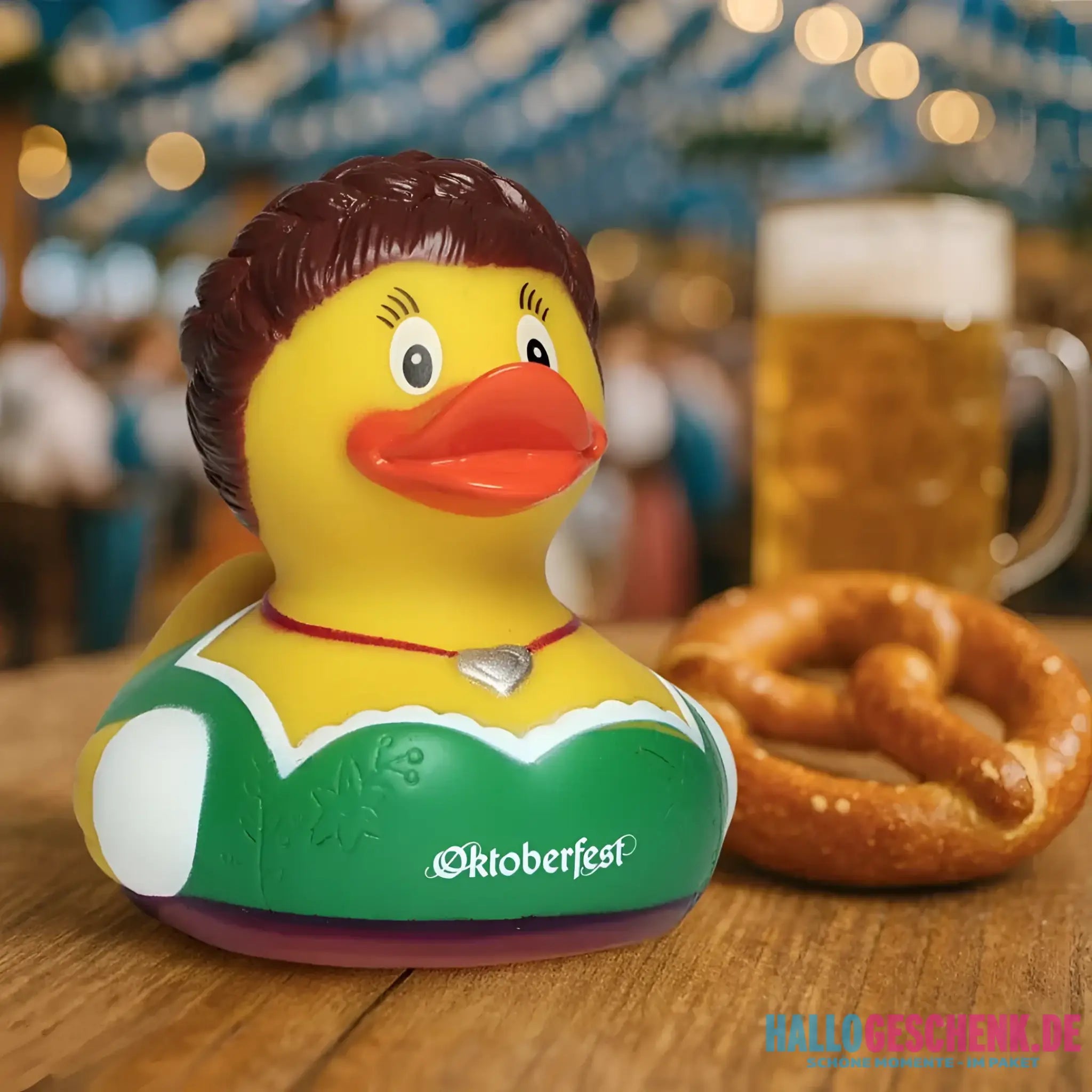 Mit liebevollen Details und traditionellem Dirndl-Look bringt diese Ente bayrische Lebensfreude in jedes Badezimmer.