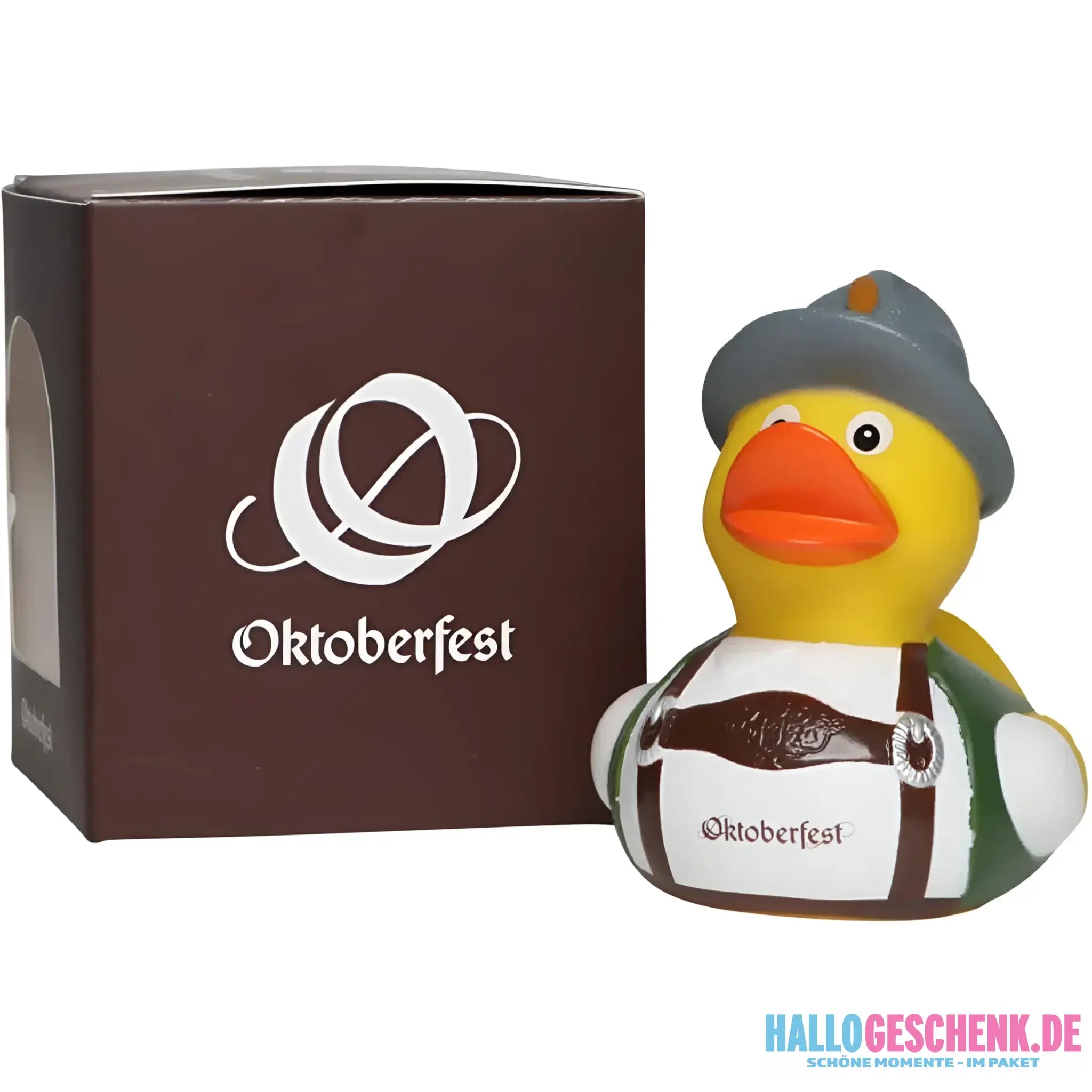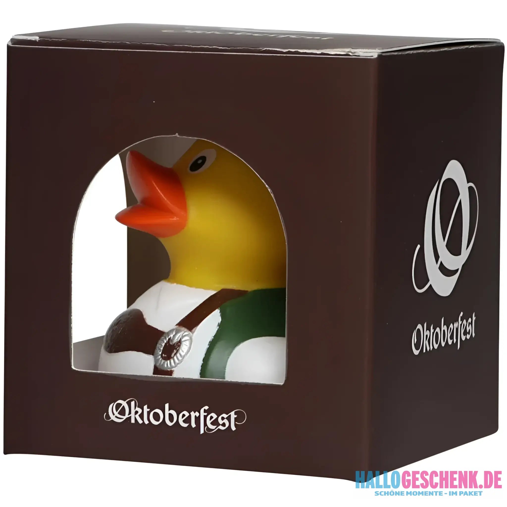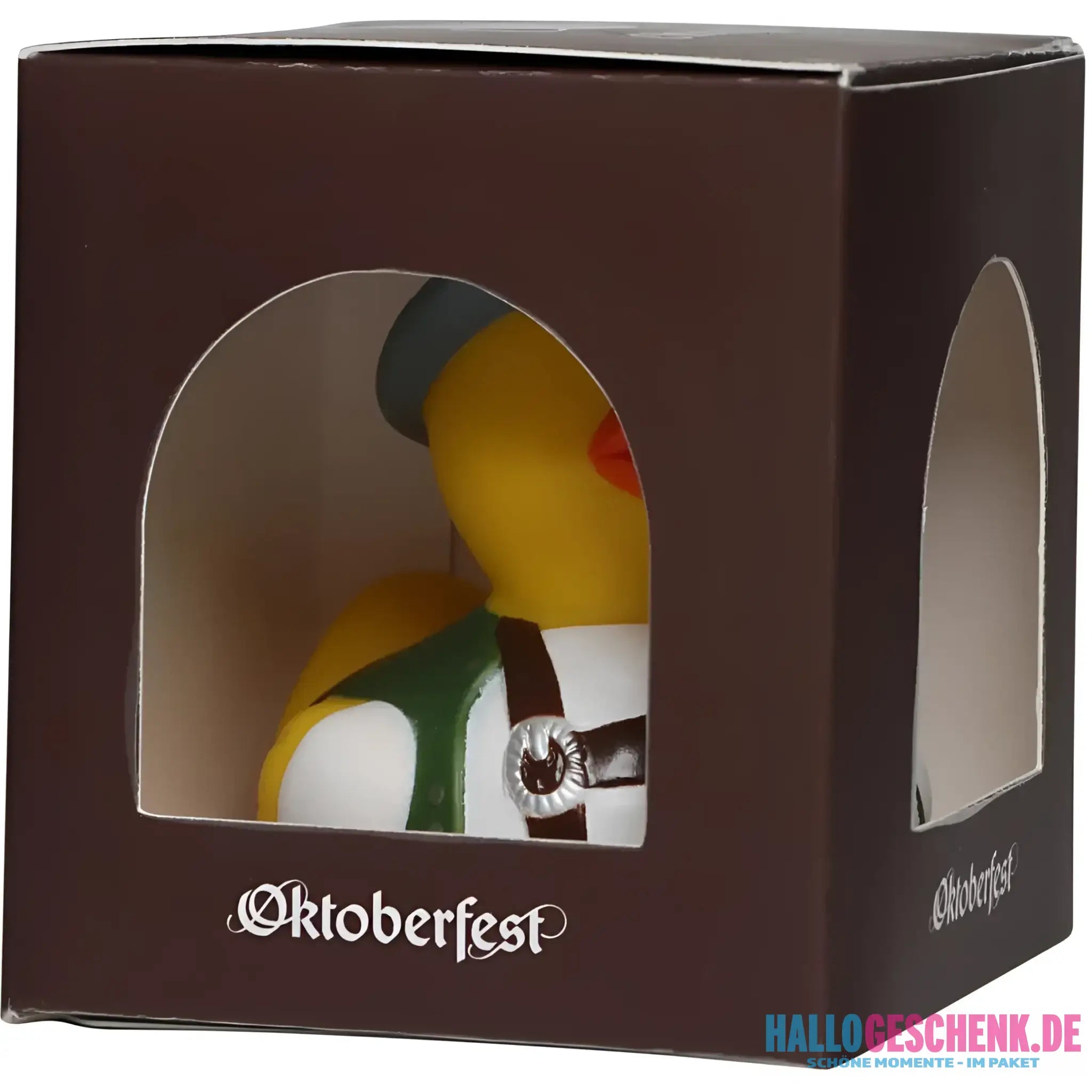 Mit klassischer Trachtenkleidung und liebevollen Details bringt diese Ente echtes Wiesn-Flair in jedes Badezimmer.