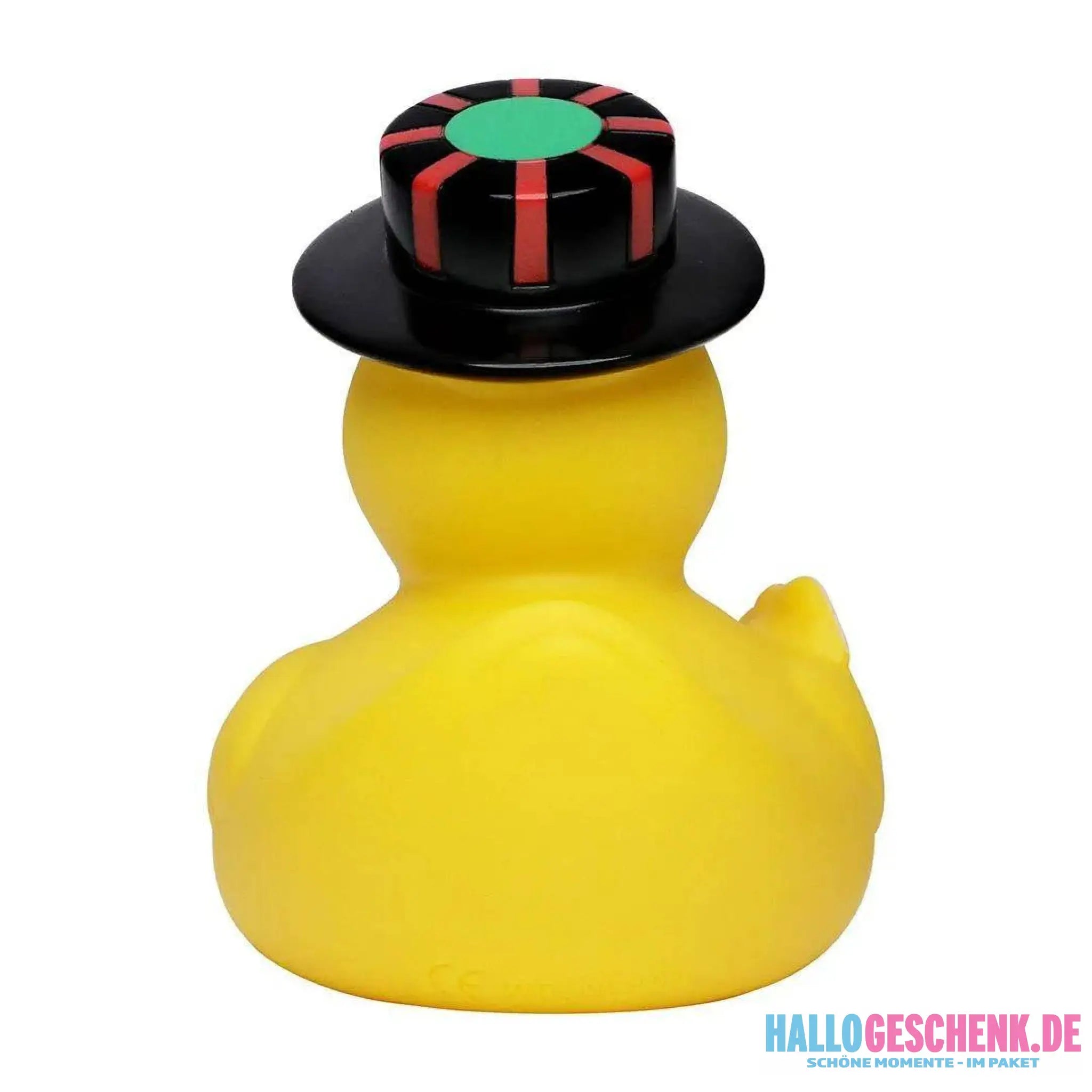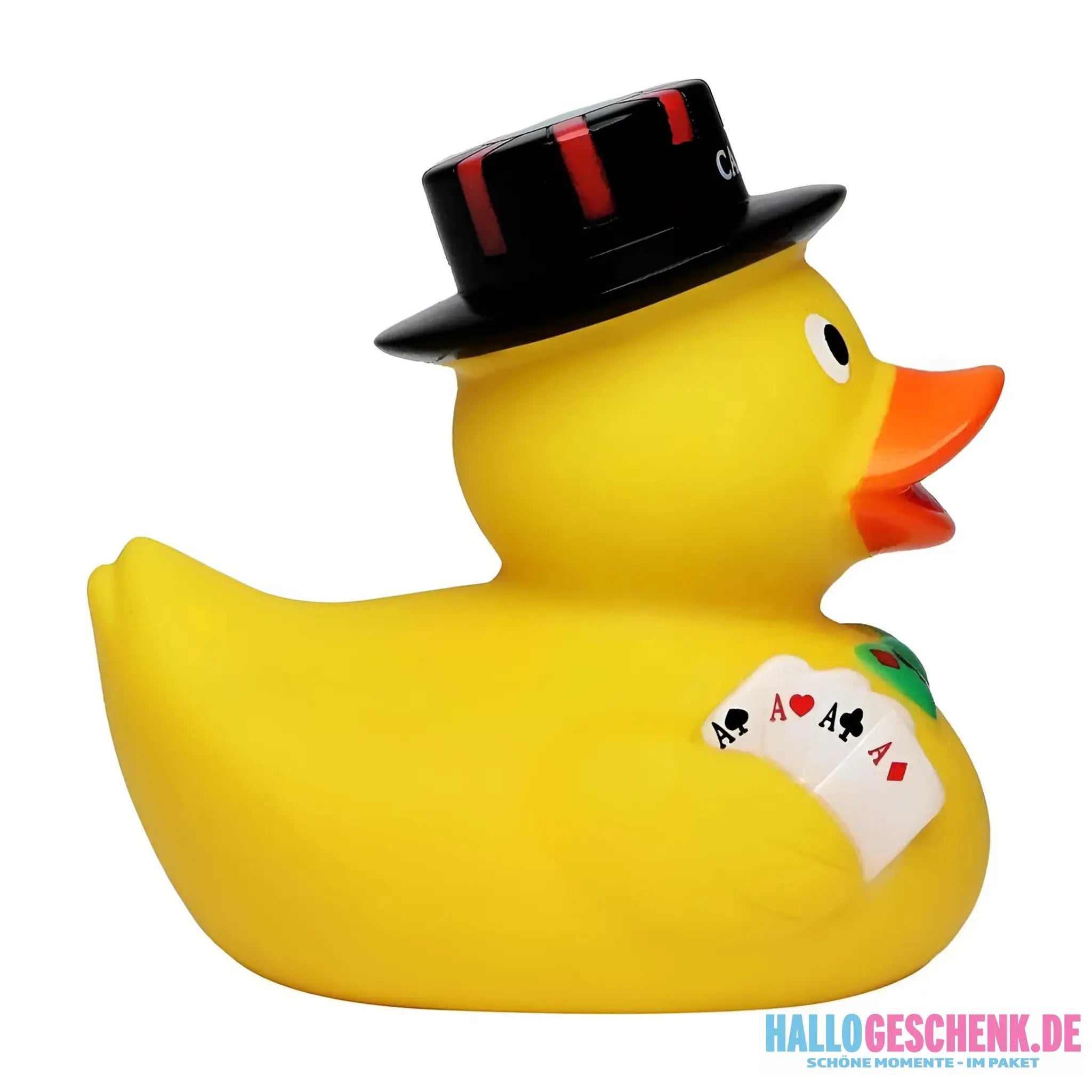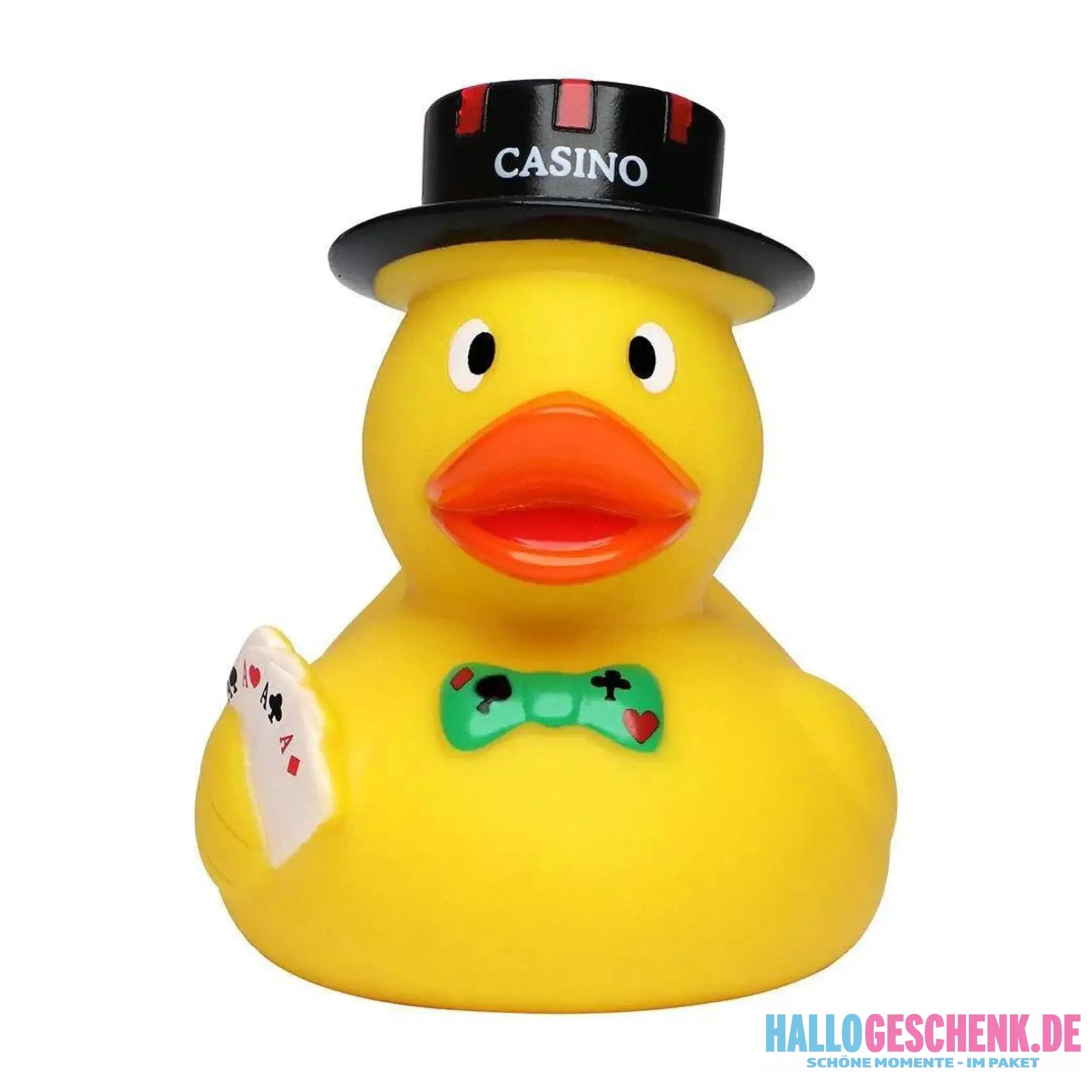 Die Pokerente mit Quietschfunktion blufft nicht! Mit 4 Assen auf der Hand gewinnt sie immer. Besonders geeignet als Aufmerksamkeit für Casinos. Passend angezogen ist sie mit grüner Fliege mit aufgedruckten Spielfarbensymbolen bereits. Mit dem Zylinder auf dem Kopf, der von oben aussieht wie ein Jeton, bringt sie auch gleich Ihren Einsatz mit.