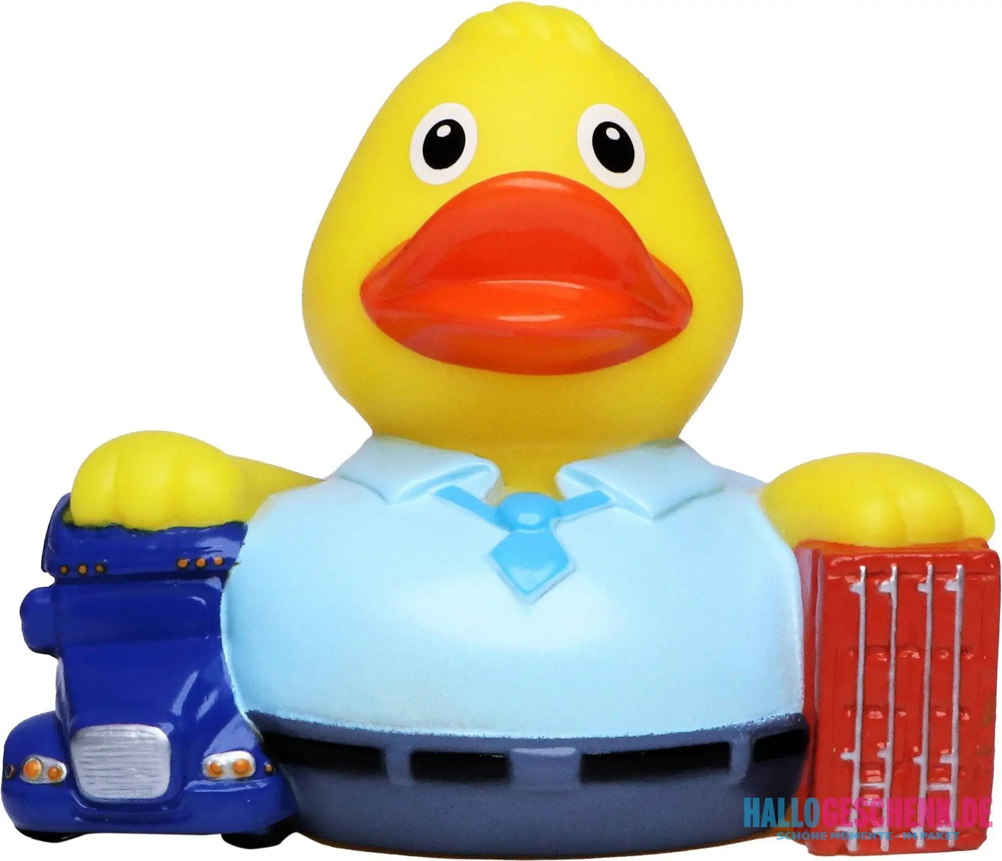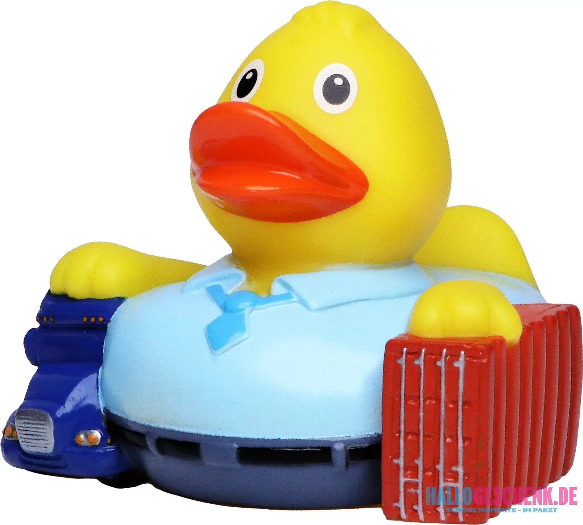 Für die Quietsche-Ente Spediteur ist nichts zu schwer! Mit Brummi unterm Arm, Krawatte und schickem Hemd führt dieses Entchen vielleicht die kleinste Spedition der Welt.