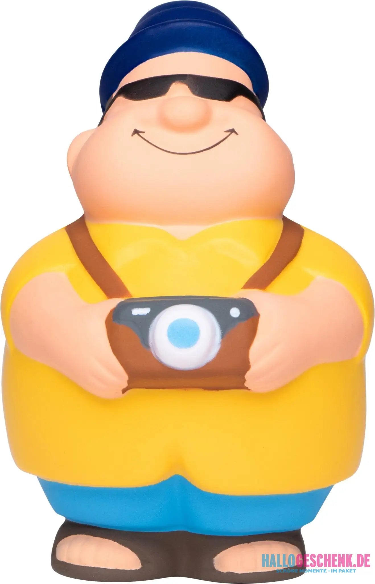 Herr Bert® als Tourist – in Sandalen, Fischerhut und Sonnenbrille ist er perfekt ausgerüstet, um alle hübschen Plätzchen dieser Welt zu erkunden und Ihnen dabei zu weniger Stress zu verhelfen! Immer dabei hat er natürlich auch seine Kamera für die schönsten Urlaubsschnappschüsse. Wer könnte bei so viel Urlaubsfeeling noch gestresst sein? SQUEEZIES® Touri Bert® zum Abbau von Stress einfach "zusammenknautschen". Durch die Materialbeschaffenheit nimmt das Produkt die Ursprungsform wieder ein.
